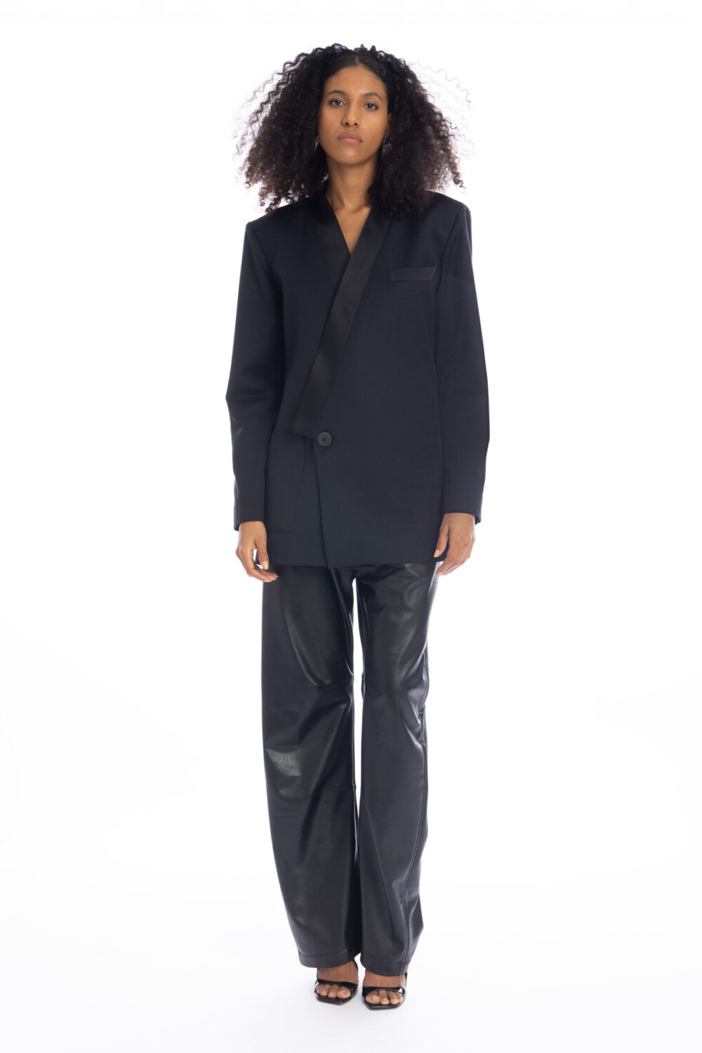 Introducing the ClassicOnyx, the perfect unisex black blazer for any occasion. Designed with a croisé lapel, this blazer adds a touch of sophistication to any outfit. Not only can it be worn as a part of a suit, but it can also be styled as a short dress, making it a versatile addition to any wardrobe.