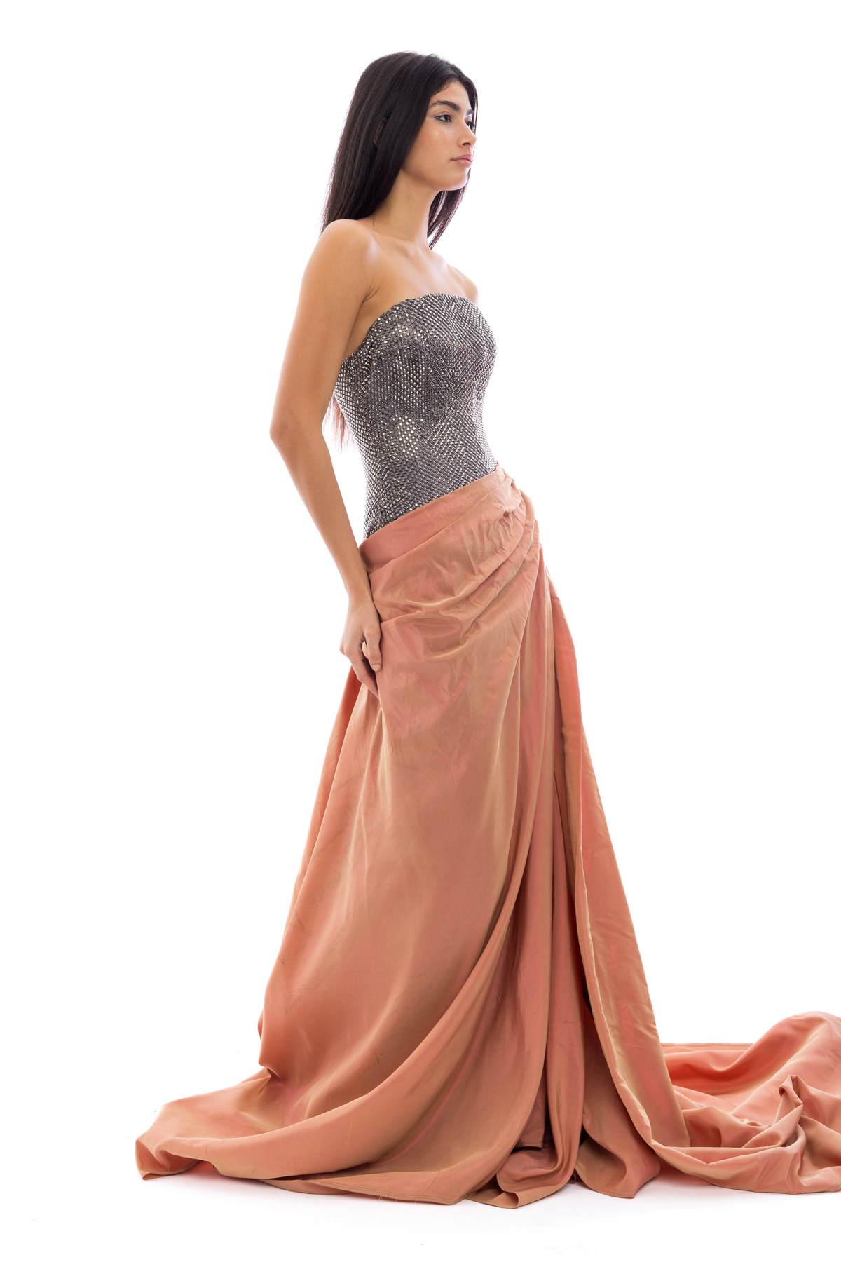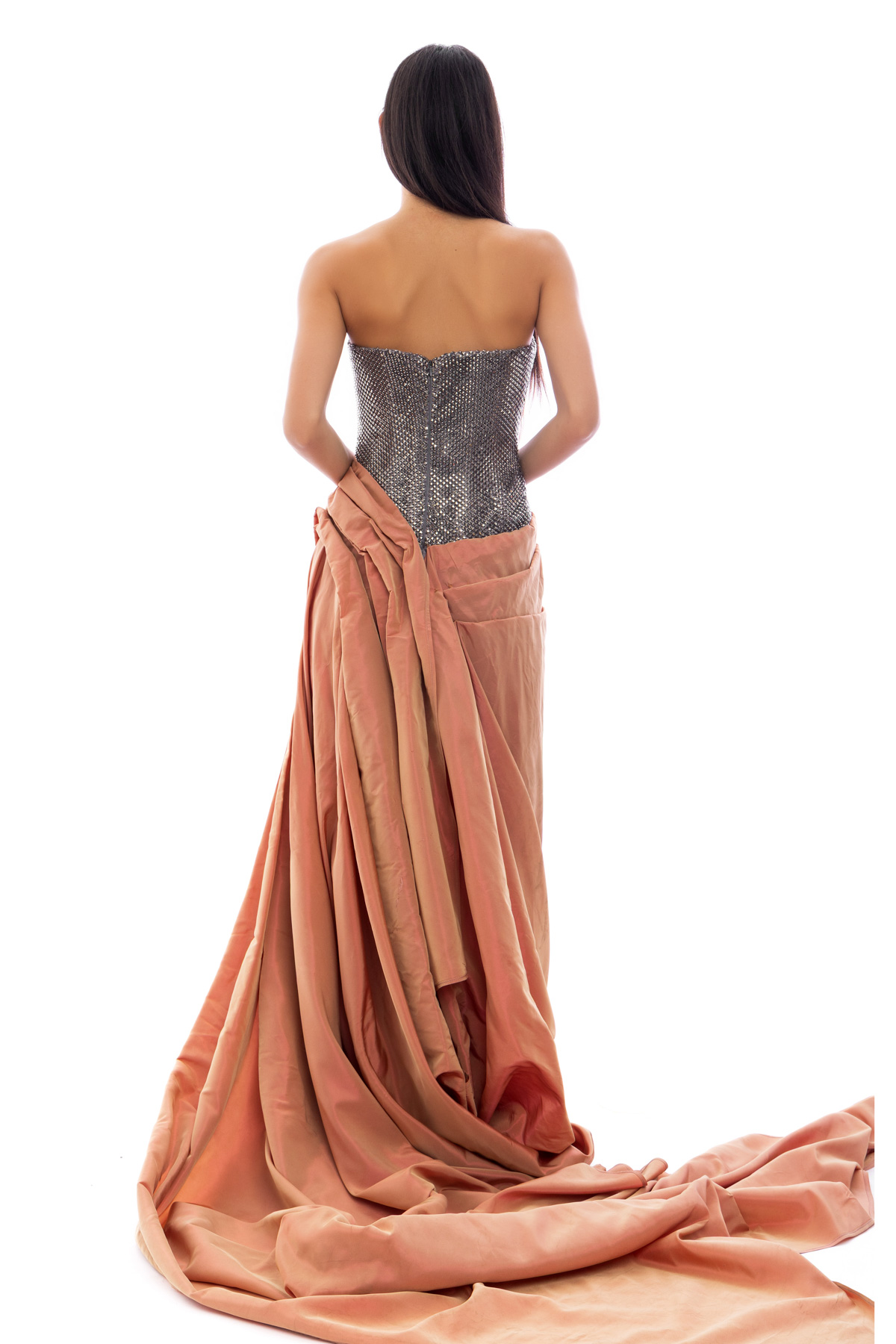 Sequin corset. With a drapped taffeta fabric embracing the waist.