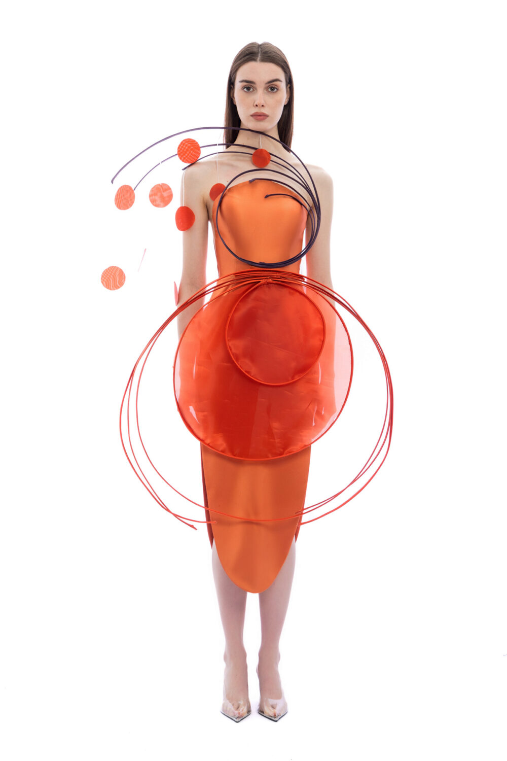 The form-fitting orange satin base serves as a canvas for intricate, orbit-like wire structures that extend outward, creating an illusion of planetary rings in motion. A striking asymmetrical arrangement of thin black and red arcs wraps around the upper body, resembling the dynamic movement of celestial bodies.