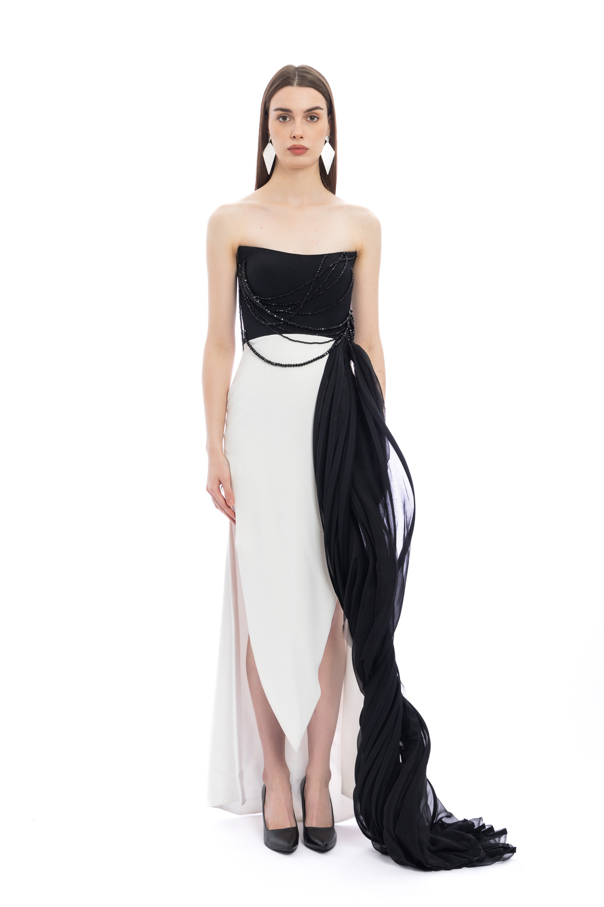 This sophisticated black and white gown exudes timeless elegance with a modern artistic twist. The strapless black bodice is adorned with delicate beaded embellishments that drape gracefully, adding a touch of refined glamour. The contrasting white asymmetrical skirt features a sleek thigh-high slit, creating a stunning balance between structure and fluidity.