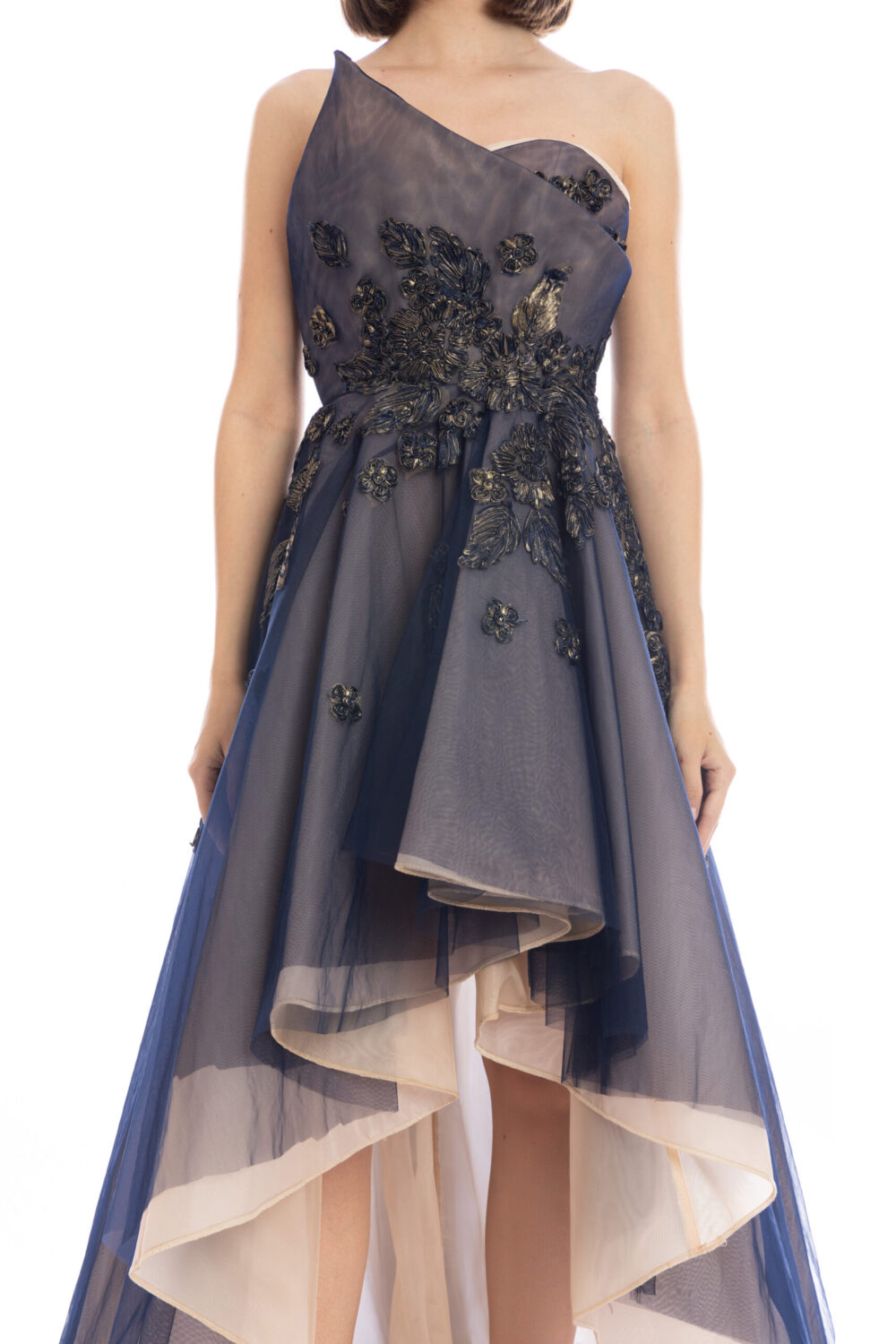 | enchants with its strapless silhouette, a canvas adorned with golden flowers that bloom with elegance. This gown effortlessly combines the cool allure of blue with the warm radiance of gold, creating a captivating and harmonious ensemble perfect for any special occasion.”