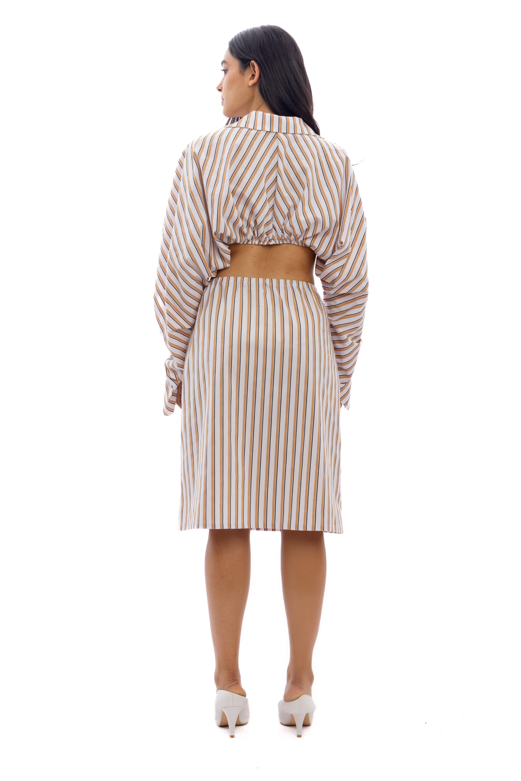A bold reinterpretation of the classic striped uniform, La Marinière from the Chapter 14 Collection fuses French nautical heritage with contemporary flair. Crafted from crisp cotton poplin, this two-piece set features a sculptural cropped blouse with voluminous ruched sleeves and a sharp collar, balanced by a structured high-waisted pencil skirt. The vertical and diagonal stripe interplay in shades of ivory, sand, and charcoal adds movement and modernity to the silhouette—refined yet fearless.