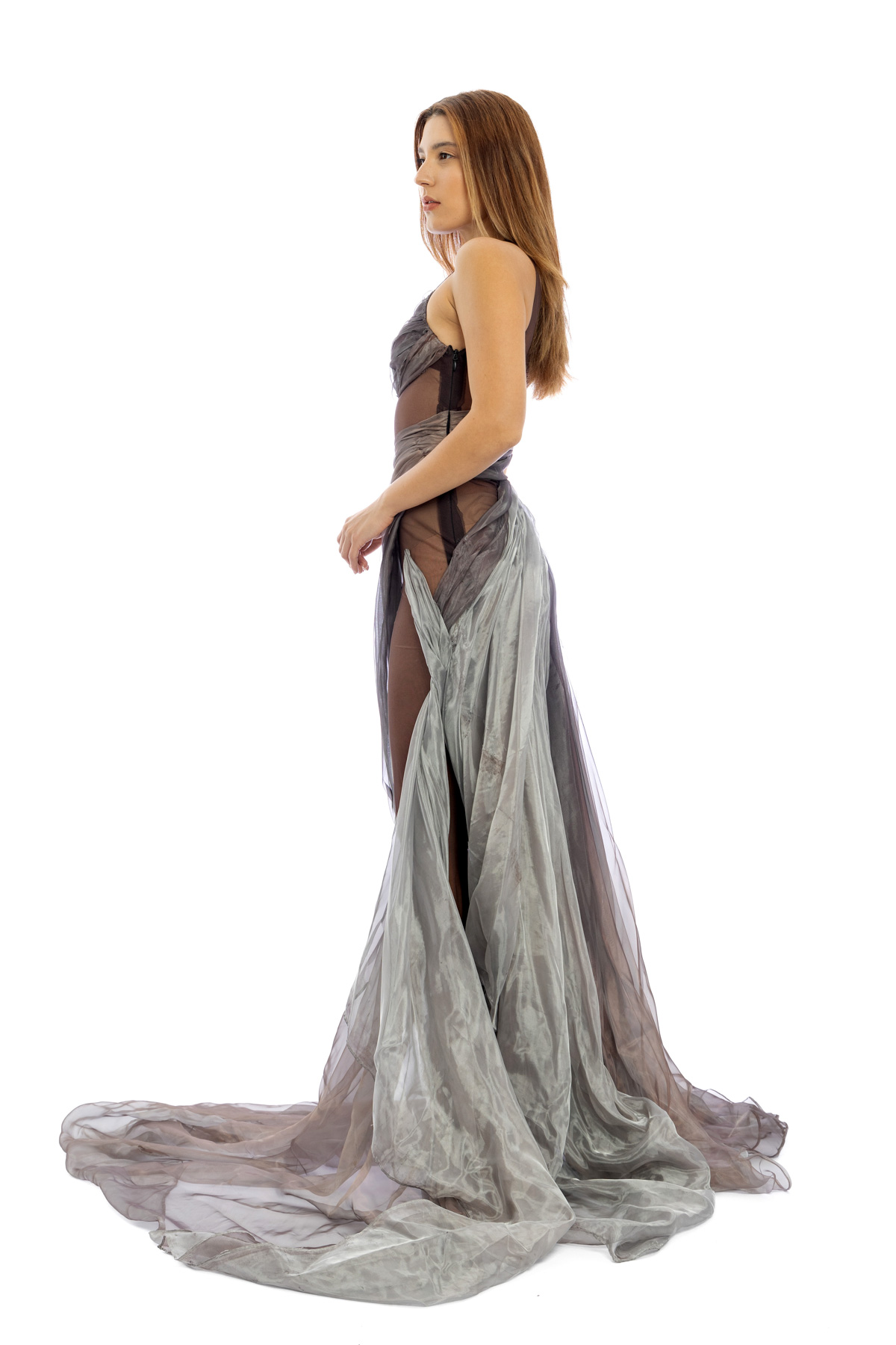 The design features a sheer, smoky tulle base that creates an illusion of fluid movement, enhanced by strategically placed fabric panels that wrap and twist around the body in an organic, wind-swept effect.The asymmetrical bodice is delicately ruched, partially revealing the skin through sheer mesh for an alluring yet sophisticated touch. The waistline is accentuated with soft, deconstructed cutouts, adding an edge to the otherwise flowing silhouette. The skirt cascades in airy, layered tulle, transitioning from deep earthy tones to muted grays, creating a gradient reminiscent of misty landscapes. A dramatic high slit elongates the figure while the floor-length train adds a regal, floating effect.