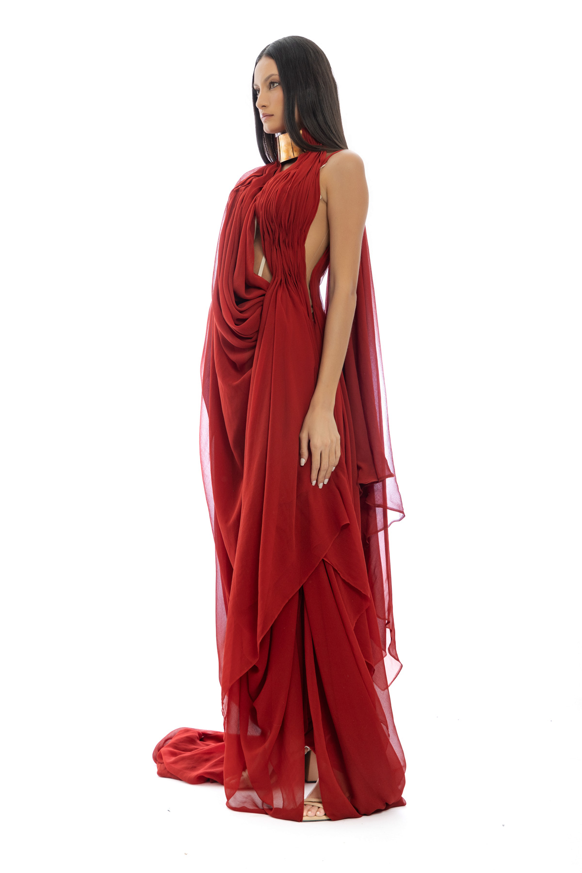 This dress is a striking and elegant draped gown in a deep, rich red hue. It features a fluid, Grecian-inspired silhouette with layers of lightweight, flowing fabric that cascade gracefully around the body. The asymmetrical draping creates a sense of movement and effortless sophistication, while the high neckline adds a regal touch, with a bold metallic choker-style collar contrasts beautifully with the softness of the fabric, adding a modern and structured element to the design. The gown has an open, slightly sheer effect, subtly revealing the contours of the body while maintaining an air of refinement.