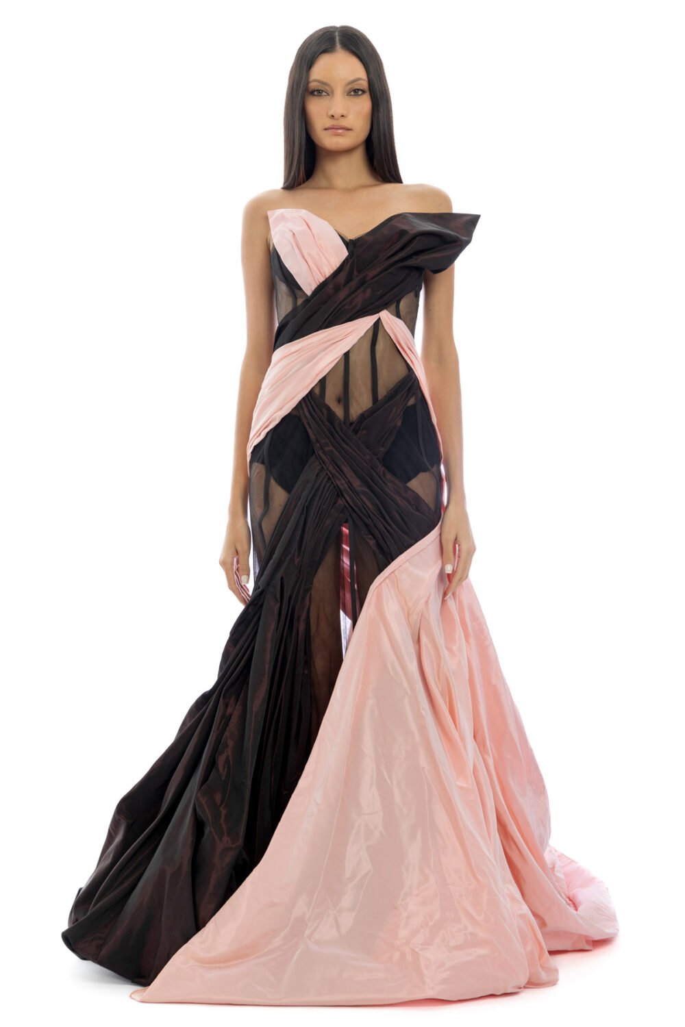 This dress crafted with a dramatic interplay of sheer black fabric and soft blush pink draping. The asymmetrical bodice features a sculptural off-the-shoulder detail, adding a touch of architectural elegance.The sheer base gives an illusionary effect, with crisscrossed black and pink panels strategically placed to create depth and contrast. The flowing skirt cascades into a voluminous train, merging both colors seamlessly for a bold yet ethereal aesthetic.