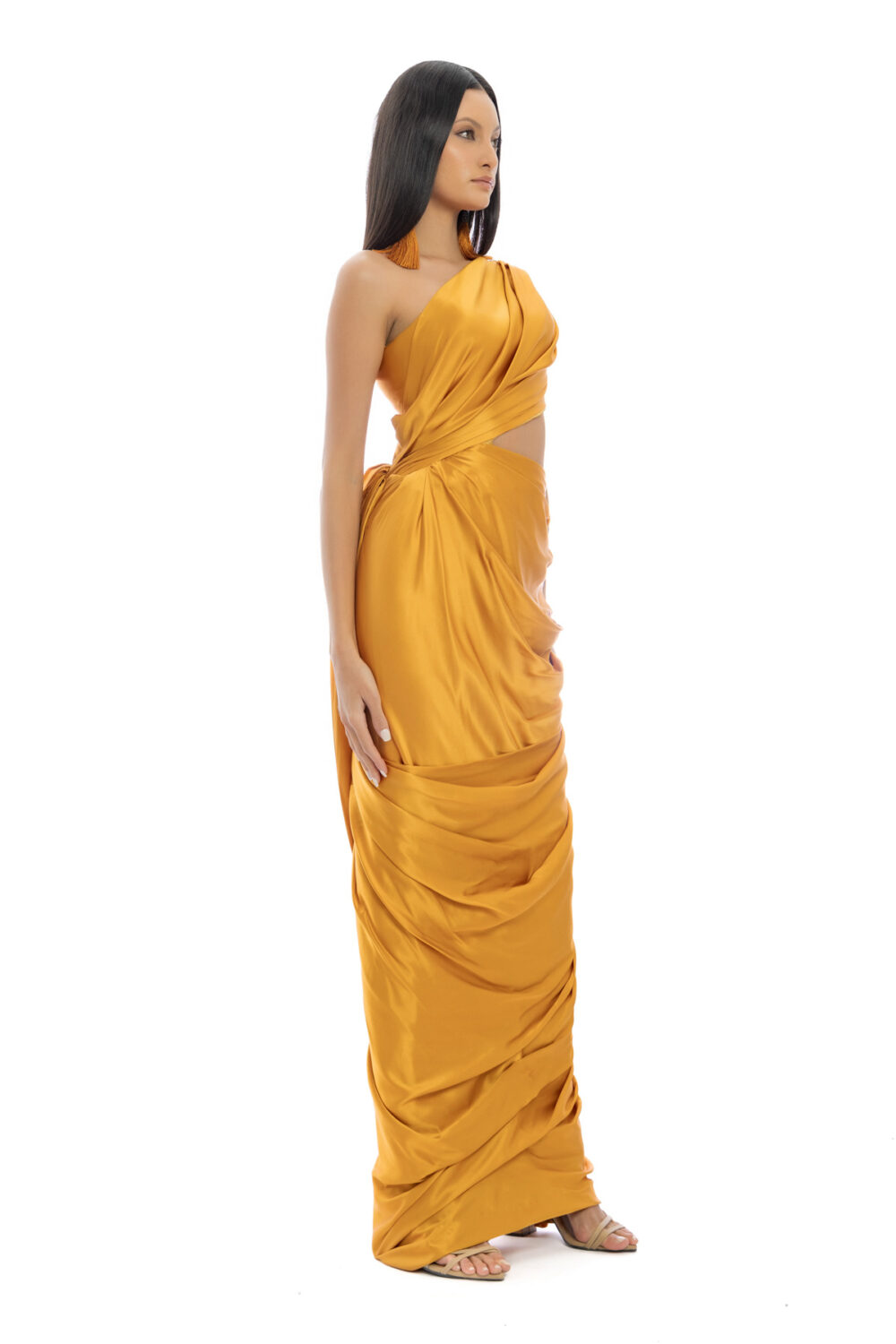 This stunning gown exudes elegance and modern sophistication, crafted from a luxurious satin fabric in a rich golden hue. The asymmetric design features a draped one-shoulder neckline that seamlessly wraps around the body, creating a sculptural effect. A striking cutout at the waist adds a contemporary touch, highlighting the figure while maintaining an air of refinement. The fabric is expertly gathered and ruched throughout the length of the skirt, enhancing movement and creating a fluid, statuesque silhouette.