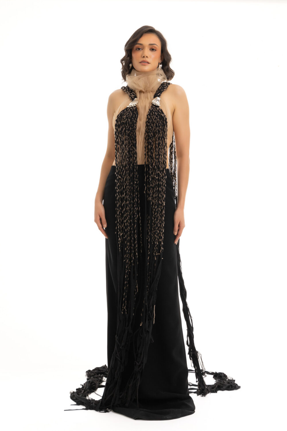 A gold belated hands radiates a long fringes gold .and long black skirt. gives you sexy bold look