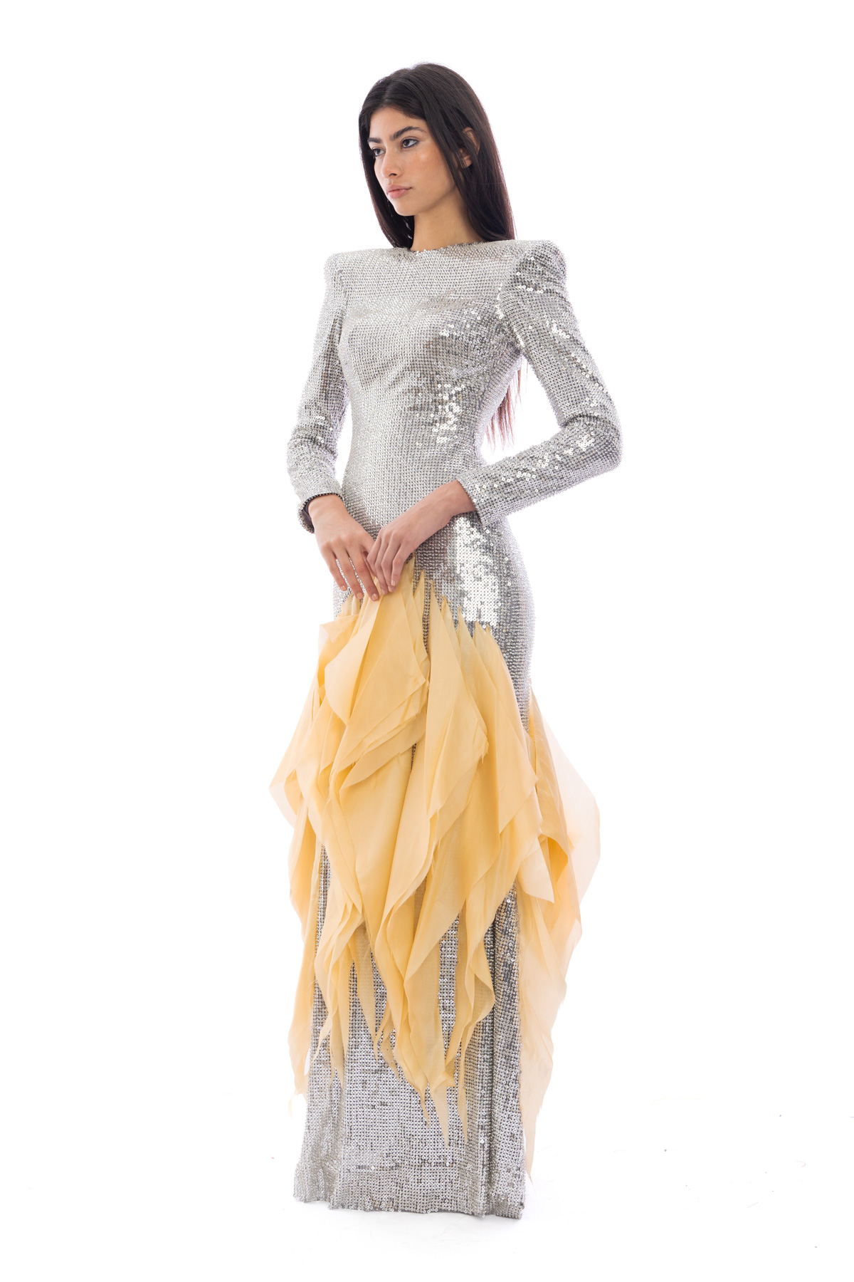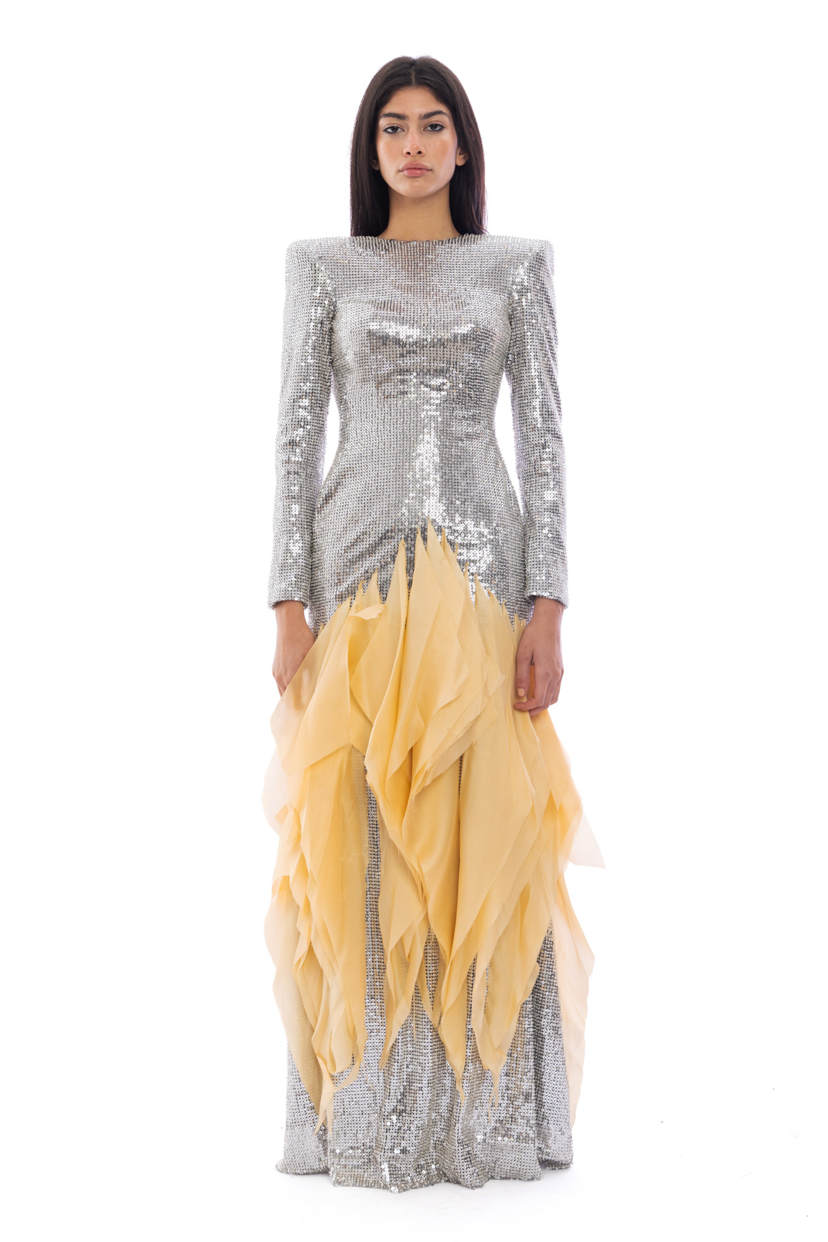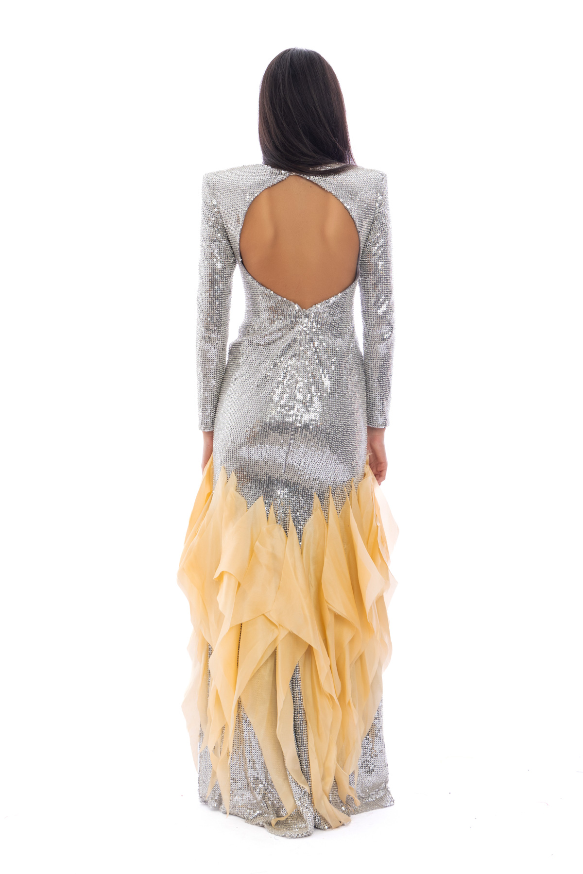 Silver sequin horologe silhouette. With a prize degrade yellow organza.