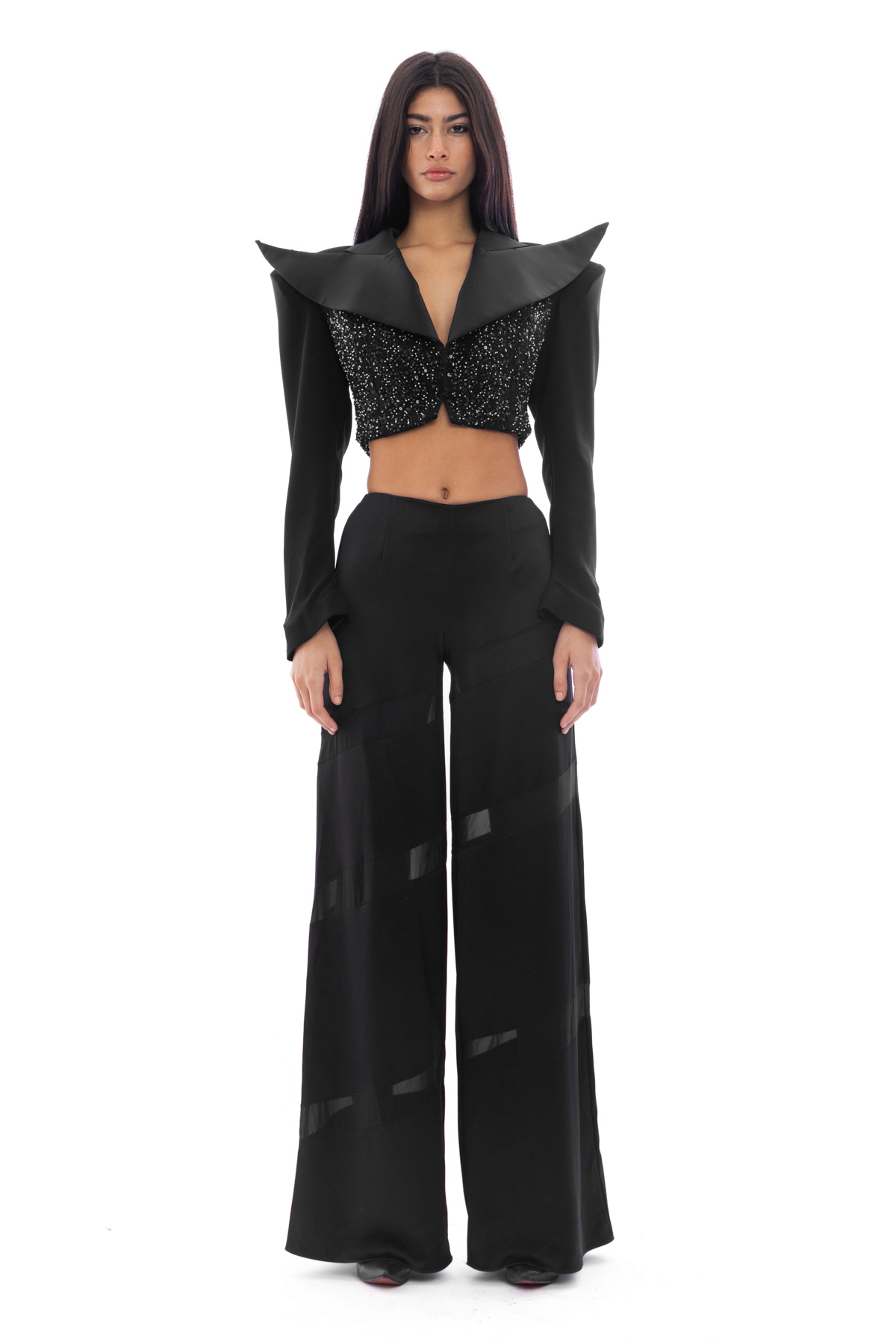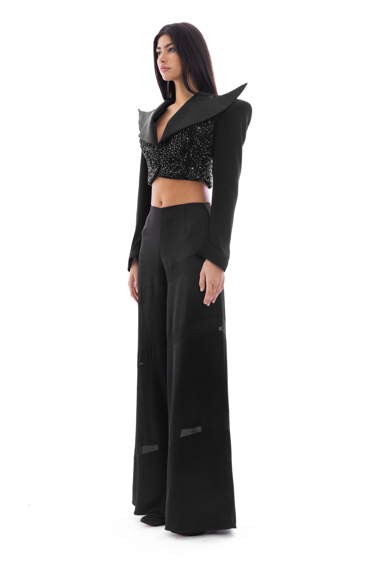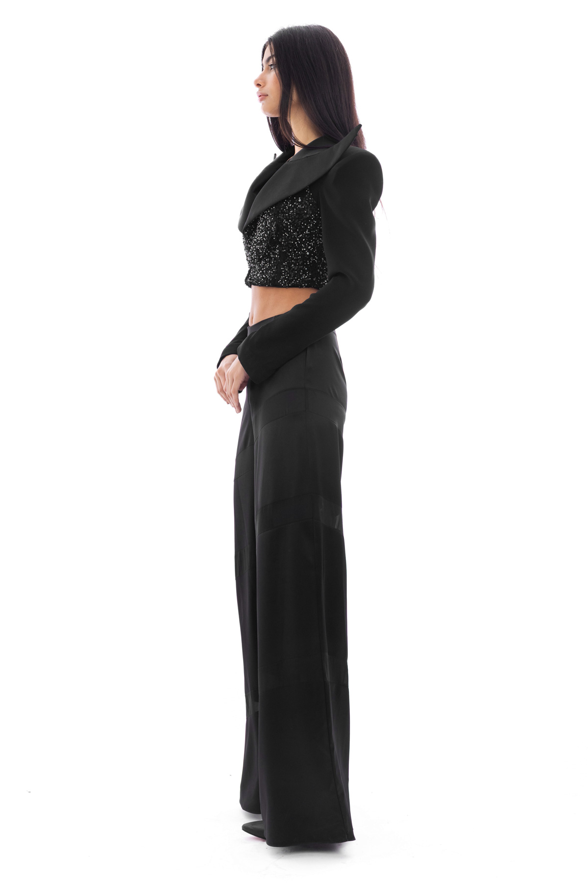 Cropped sequin blazer with an vanguard collar. Matching with a flared satin pants.