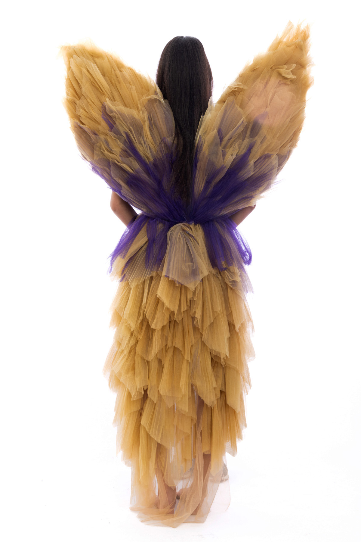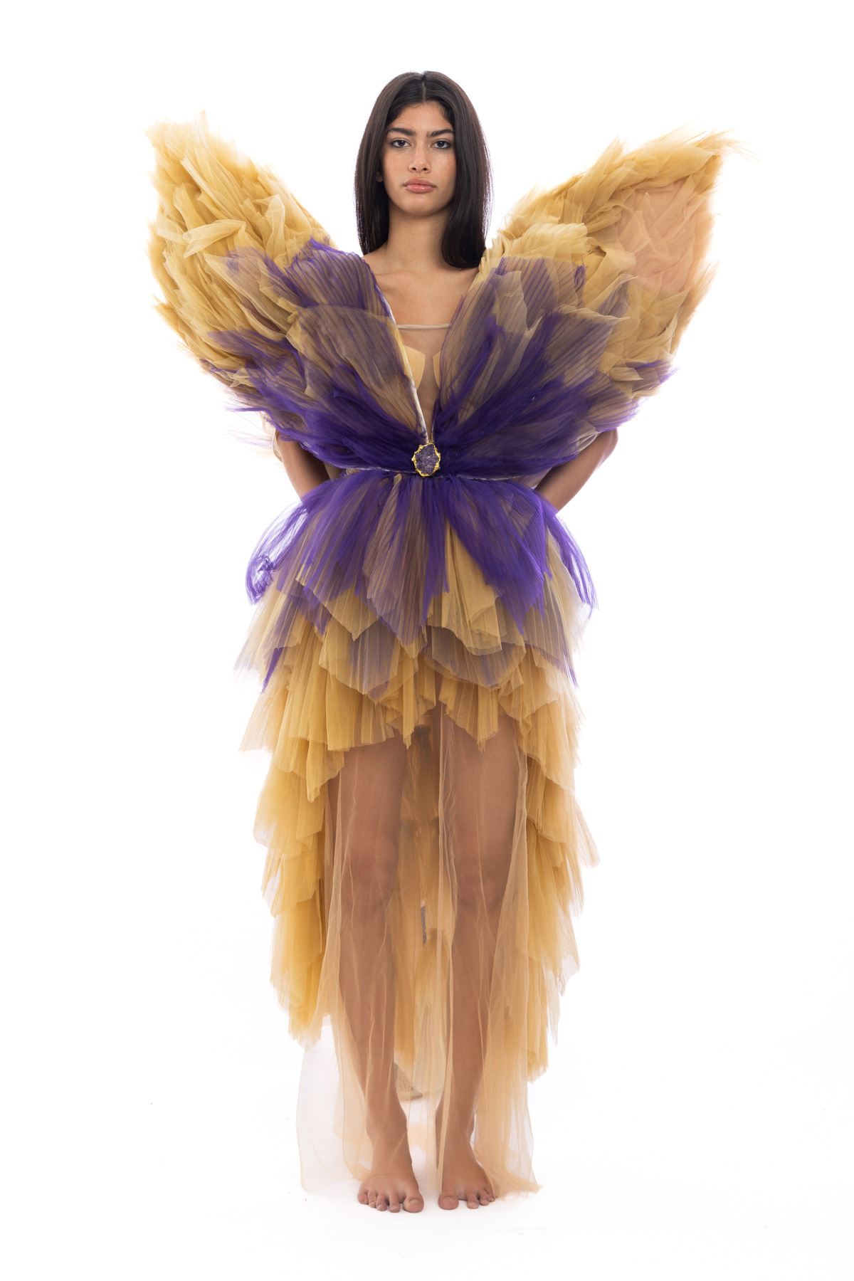 Maison Saedi master piece. The flawless plisse tulle gown. Embedment with a sea purple crystal.