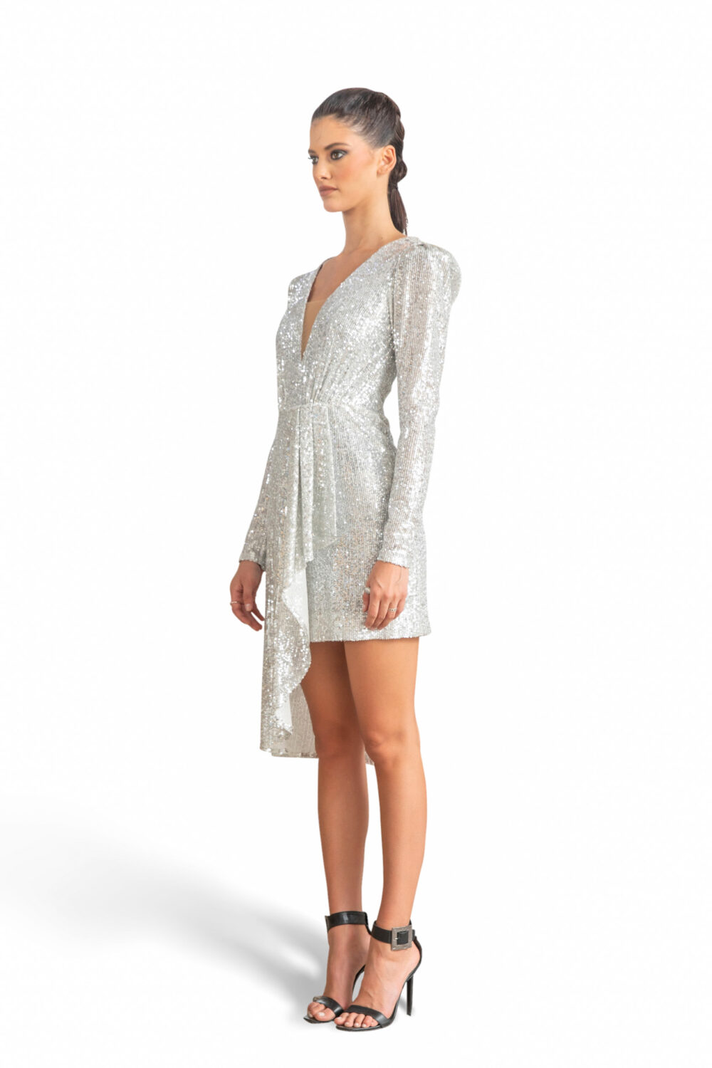 A dress specially made to party, the stunning silver shade in sequins and the bold shoulders that are always a bonus with a high low ruffled skirt to give you the awesome party look.