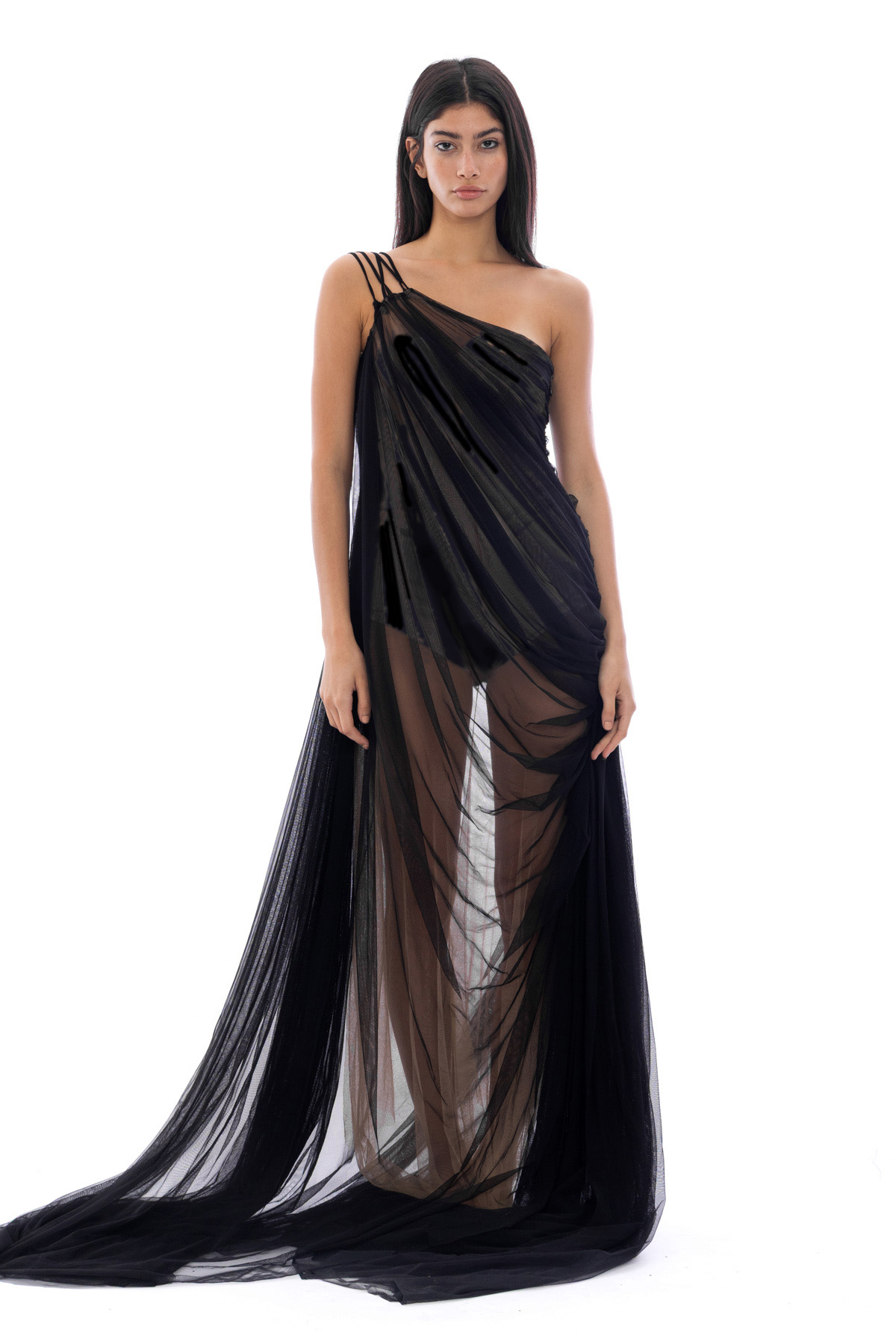 A black flawless draped tulle. Embracing the body into a couture gown.