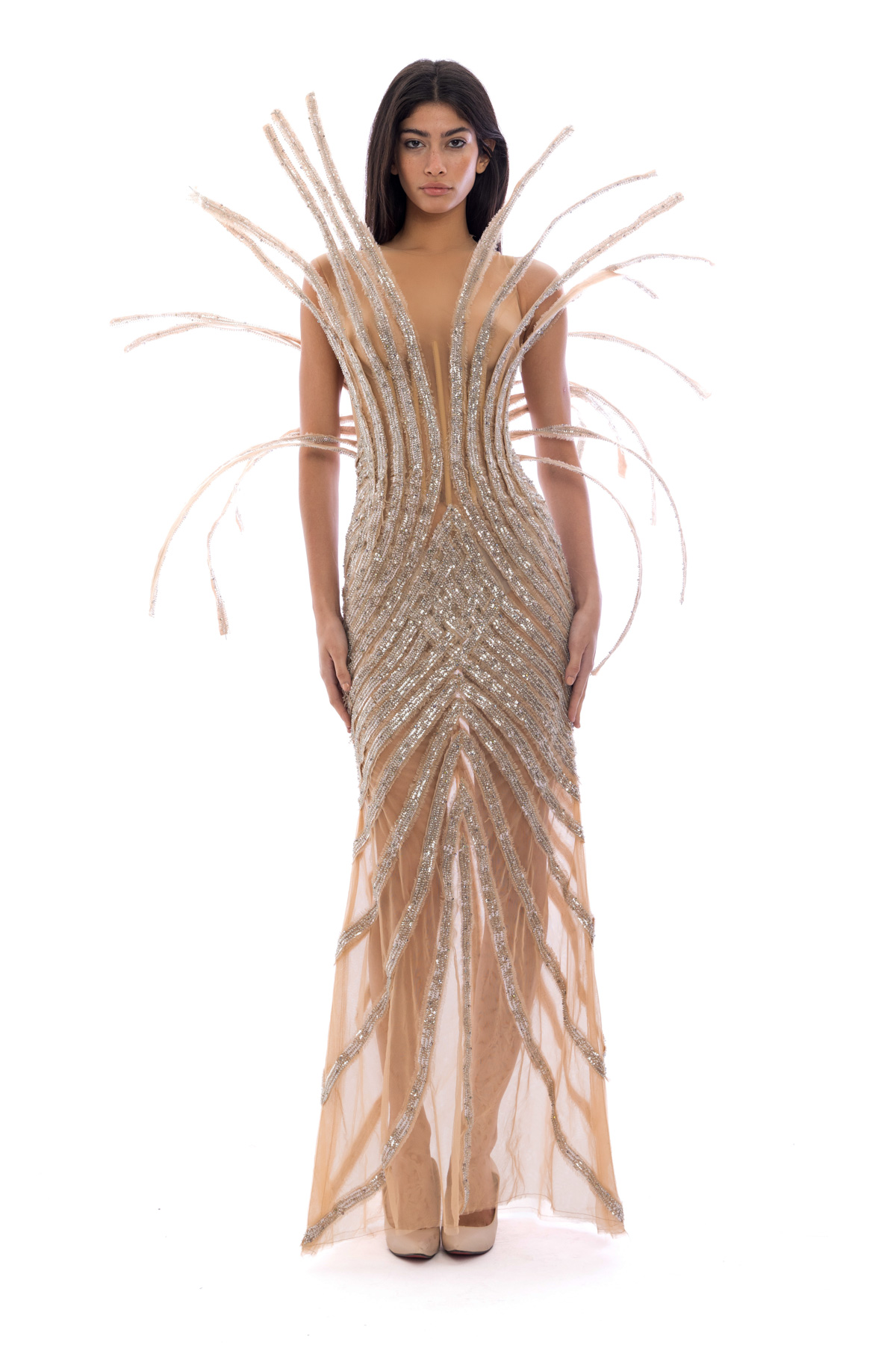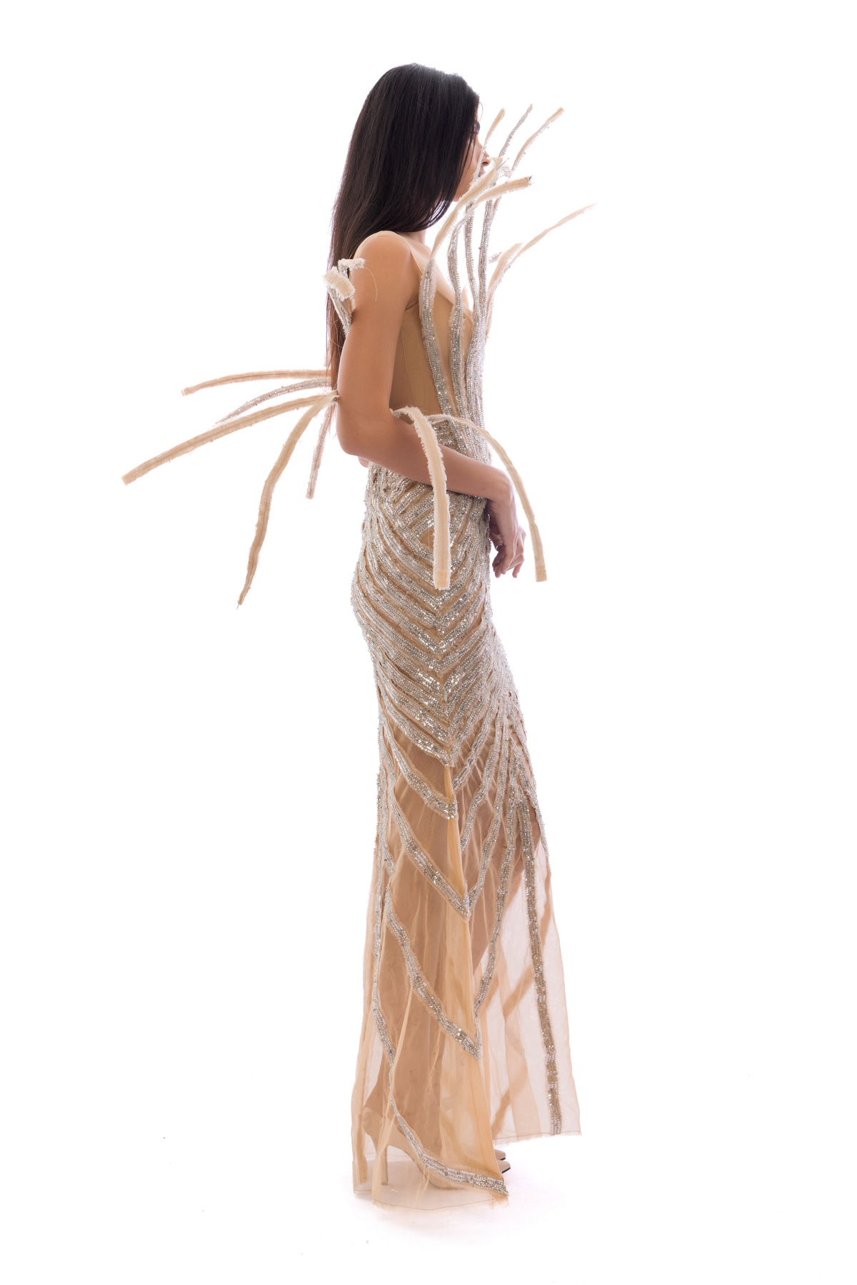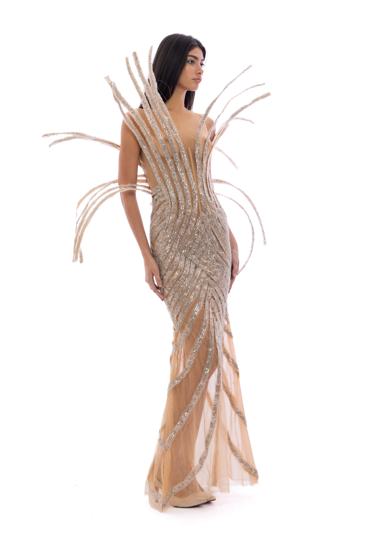 Emerging sliver sequin strip gown. mastering an avant-garde look.
