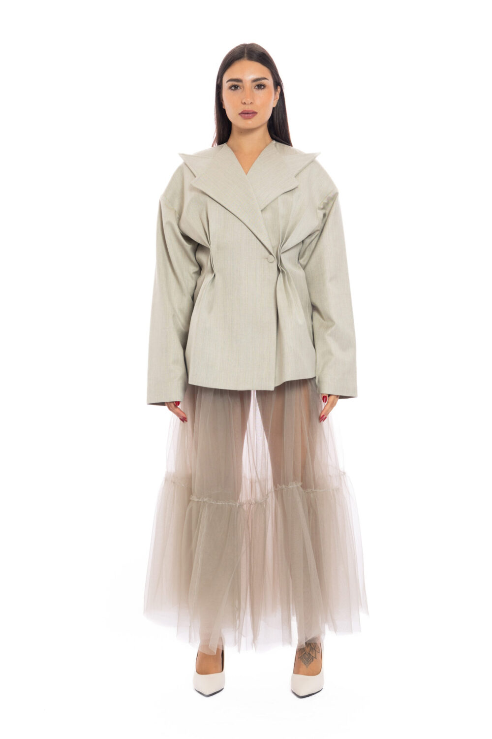 Introducing the Solène, a must-have addition to any women’s wardrobe. This oversized deconstructed blazer features special lapels and a double breasted design for a modern, edgy look. With its relaxed fit and minimalistic aesthetic, the Solène is the perfect blend of sophisticated and fashion-forward. Whether you pair it with jeans and a t-shirt for a casual day look or dress it up with a sleek dress for a night out, this blazer is sure to make a statement. Made with high-quality materials and attention to detail, the Solène is a versatile piece that will elevate any outfit. Add the Solène to your collection and embrace your unique sense of style.