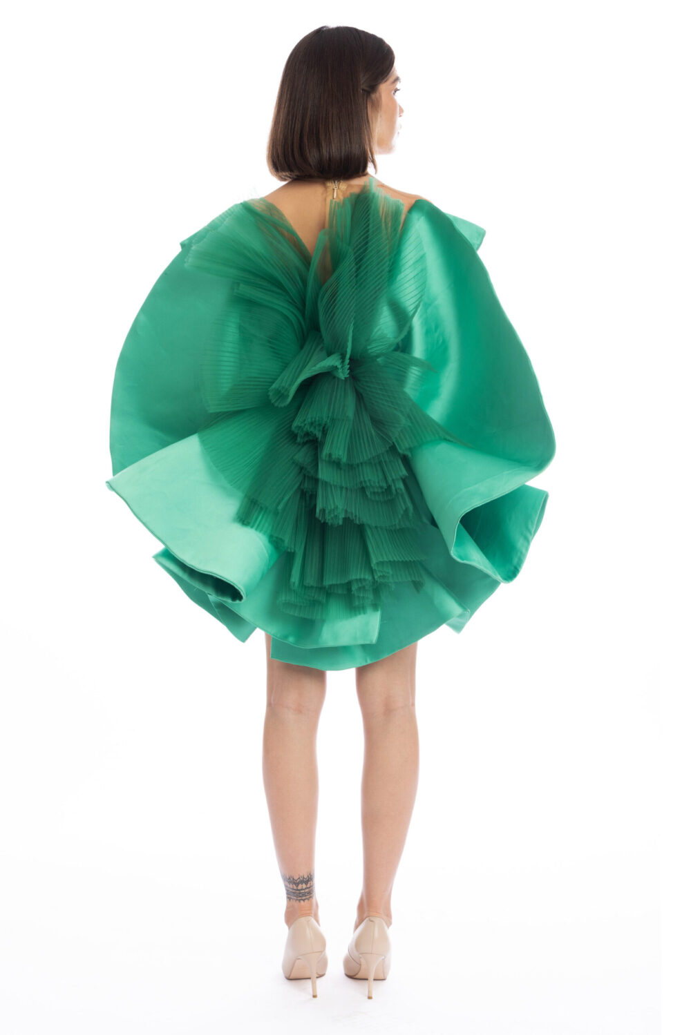The Spectaculaire is a stunning green short dress that is sure to turn heads. Its defining feature is the dramatic chunchy drapes at the back, adding a touch of elegance and sophistication to the design. The dress is made from high-quality materials, ensuring both comfort and durability. Ideal for any formal occasion, this dress is perfect for those looking to make a statement. Its unique design is sure to make you the center of attention wherever you go.