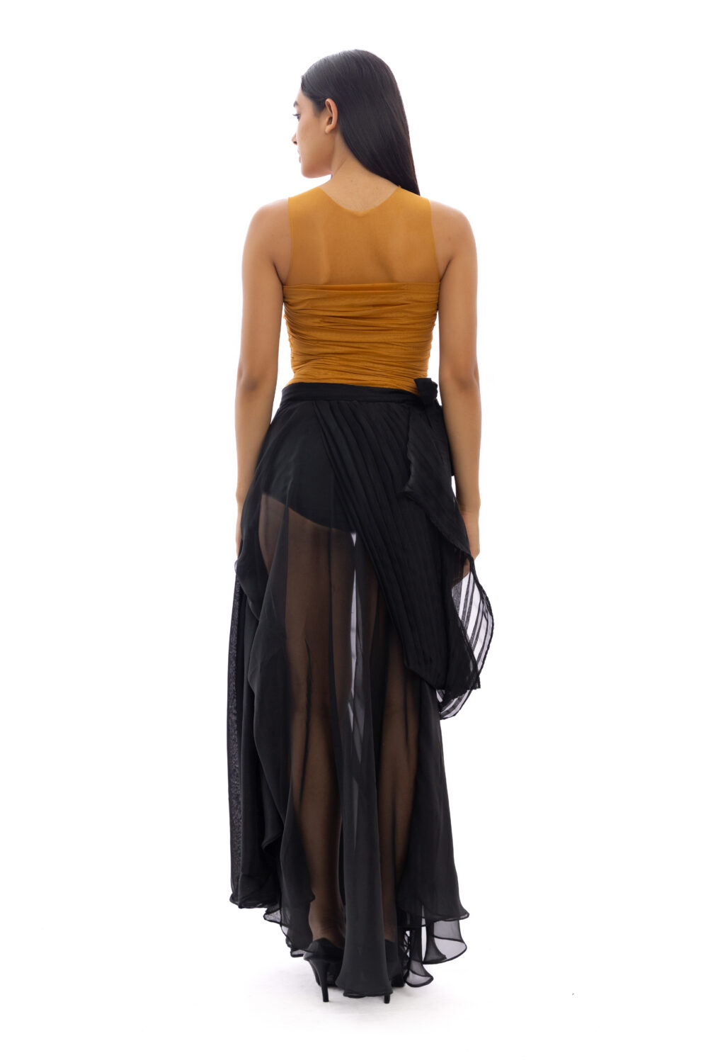 Radiating strength and sensuality, The Beacon Bodysuit from Chapter 14 channels the spirit of the SS25 couture collection into a daring yet refined silhouette. Crafted from stretch tulle-lycra in a rich mustard hue, the bodysuit wraps the body in dynamic drapes—reminiscent of wind-swept sails or sunlit fabric caught mid-motion on deck.