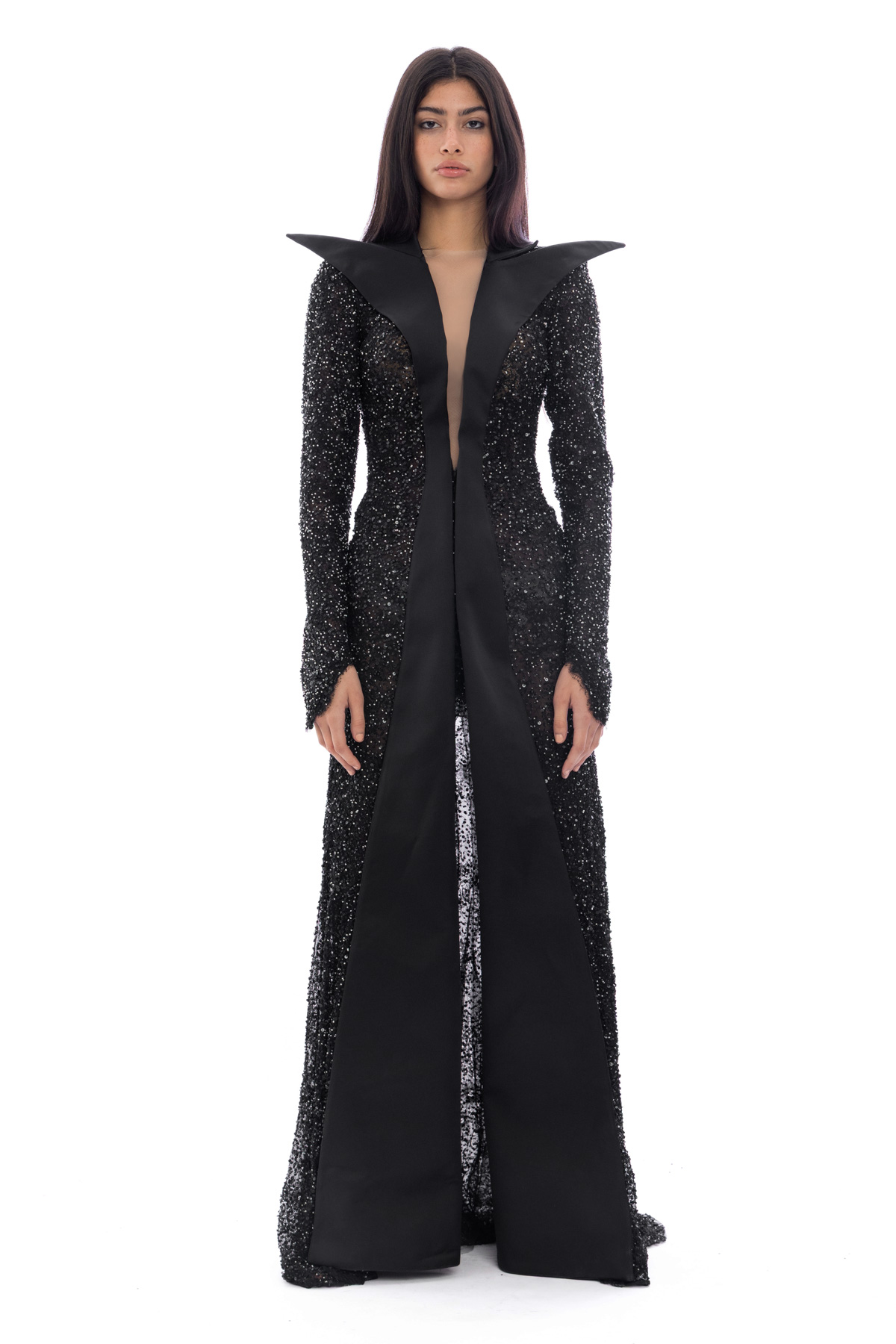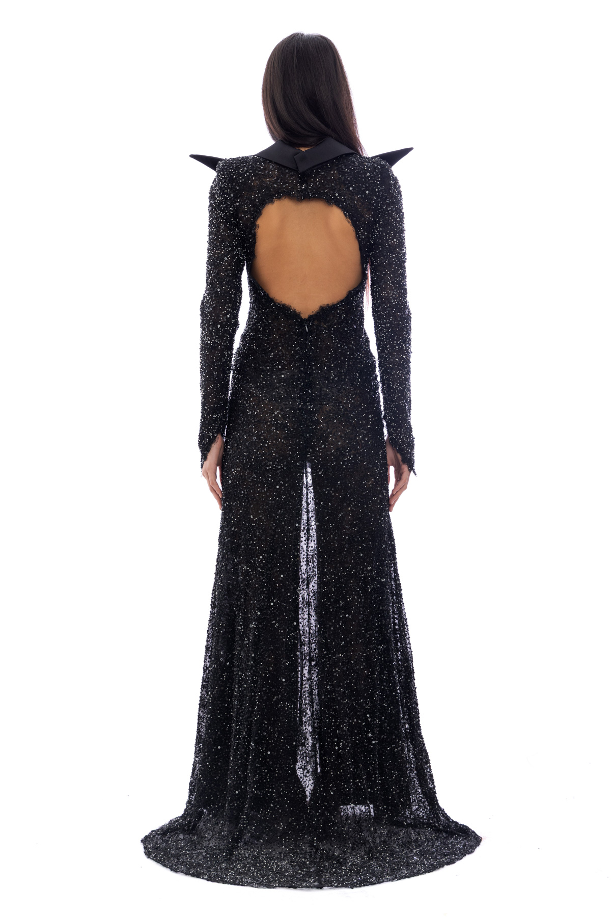 Sequined black/silver transparency silhouette. With an horloge mirrored big collar meeting in the center.